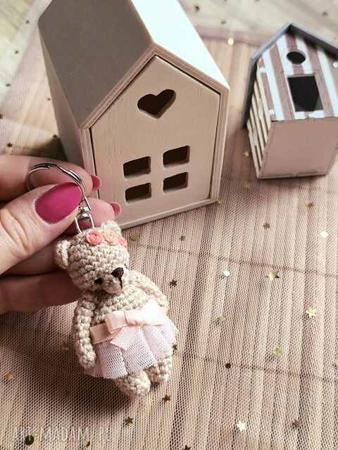 Jest to ręcznie robiony miś breloczek. Jego całkowita długość to ok 6,5 cm plus elementy metalowe ok 2,5 cm.